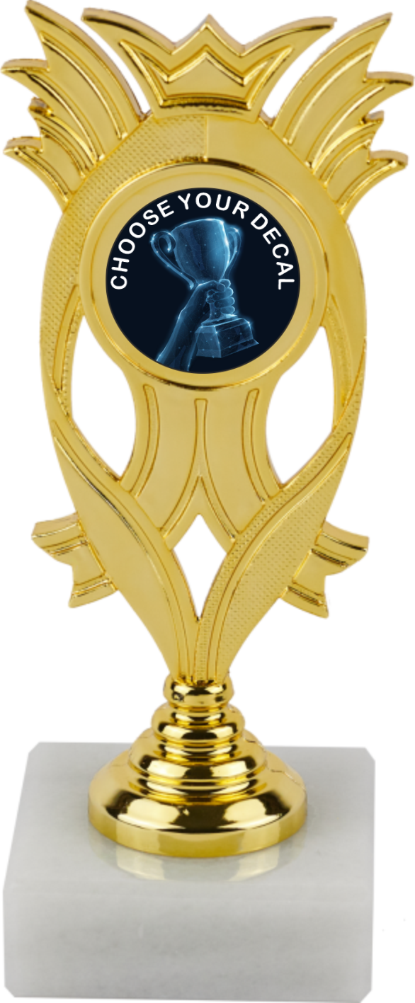 The award showcases a gold top affixed to a sleek white marble foundation.