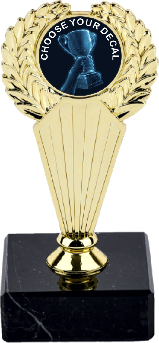 The award showcases a gold wreath holder affixed to a sleek black marble foundation.